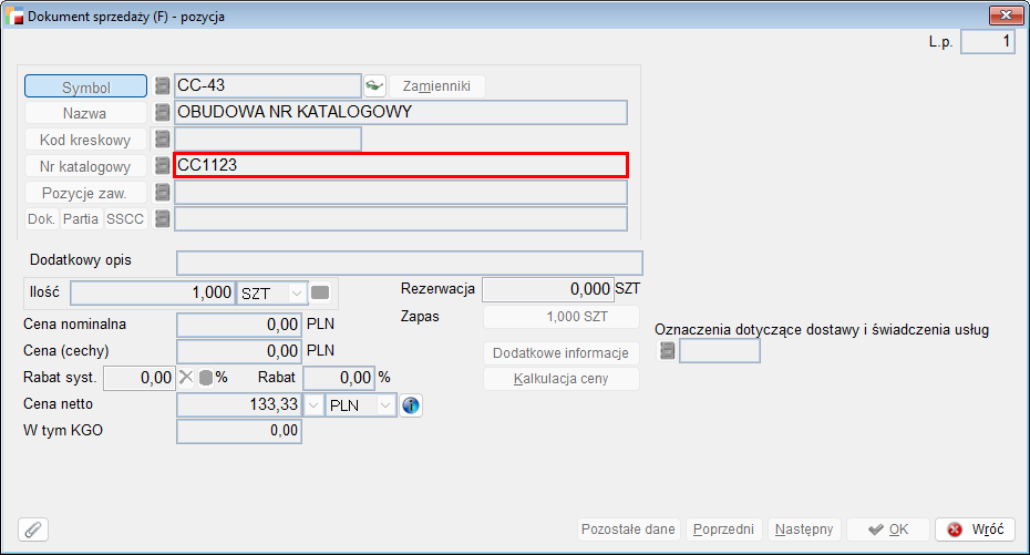 Podczas dodawania pozycji dokumentu F /NKS/26/000010 wskazano artykuł CC-42 z nr katalogowym CC1123.