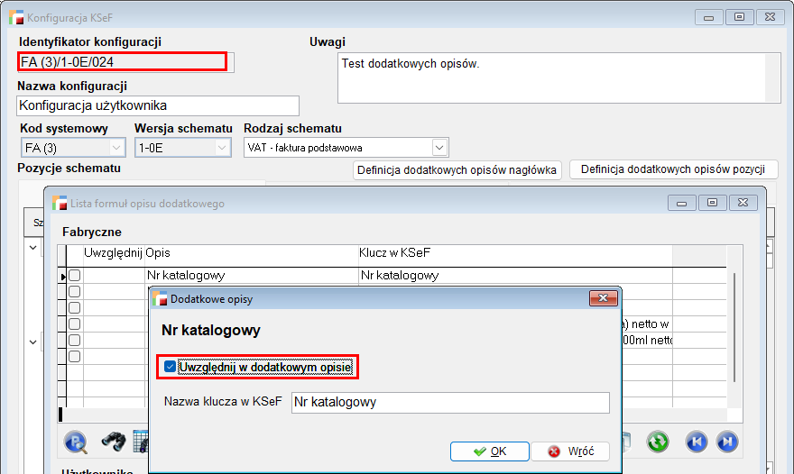 Wskazana konfiguracja posiada włączone uwzględnianie Nr katalogowego w dodatkowym opisie w Definicji dodatkowych opisów pozycji.
