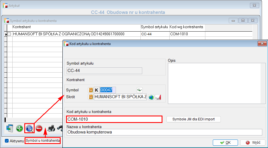 Artykuł CC-44 ma skonfigurowany Symbol u kontrahenta K00047 tj. COM-1010.