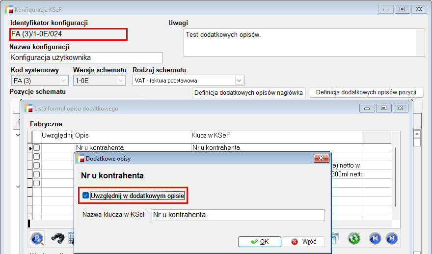 Wskazana konfiguracja posiada włączone uwzględnianie Nr u kontrahenta w dodatkowym opisie w Definicji dodatkowych opisów pozycji.
