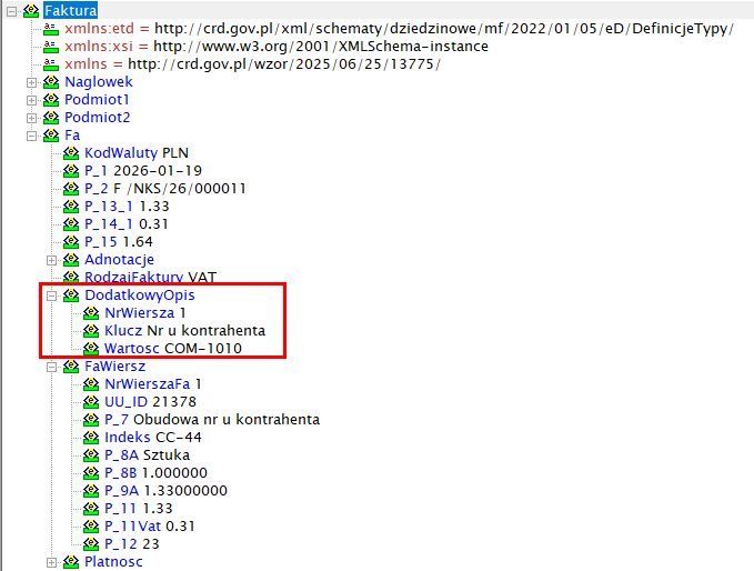 W efekcie w wygenerowanym XML’u dla dokumentu F /NKS/26/000010 w węźle Fa znajduje się gałąź DodatkowyOpis zawierająca tagi: