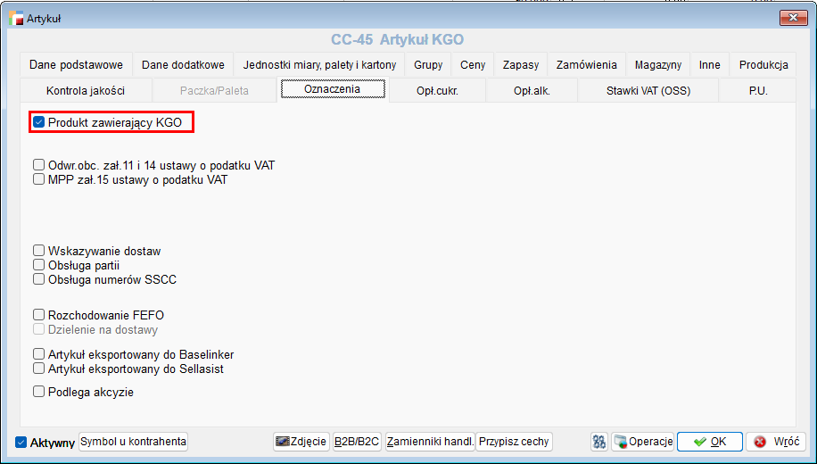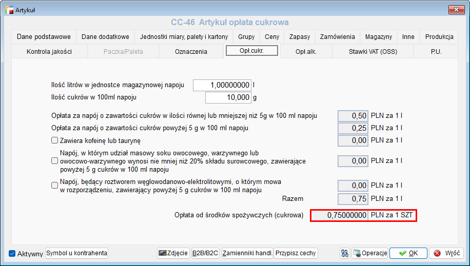 Artykuł CC-46 posiada skonfigurowaną Opłatę od środków spożywczych (cukrową), wynoszącą 0,75 PLN za 1 SZT.