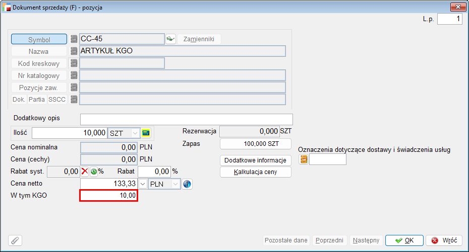Dodając pozycję z artykułem CC-45 do dokumentu sprzedaży F /NKS/26/000012, w polu W tym KGO wprowadzona została wartość 10,00 PLN.