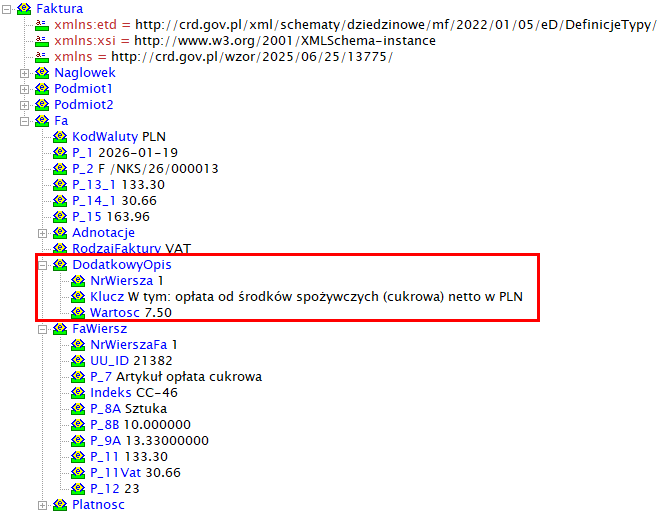 - <Klucz> zawierający nazwę klucza w KSeF tj. domyślnie W tym: opłata od środków spożywczych (cukrowa) netto w PLN,