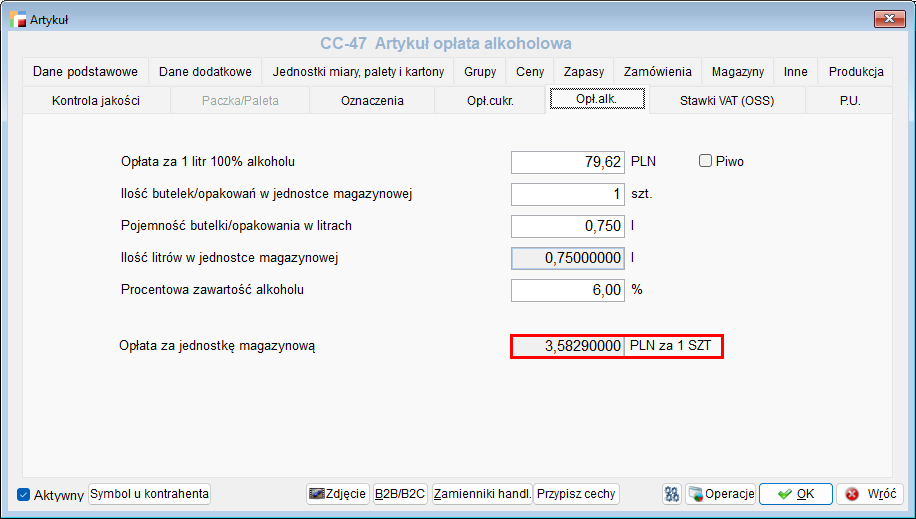 Artykuł o symbolu CC-47 posiada skonfigurowaną opłatę alkoholową wynoszącą 3,5829 PLN za 1 SZT.