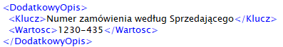 Po dodaniu dokumentu zawierającego pozycje z przypisaną cechą, wygenerowany plik XML w sekcji <DodatkowyOpis> zawiera tag <Klucz>, którego wartością jest nazwa cechy, oraz tag <Wartość>, który zawiera wartość cechy.