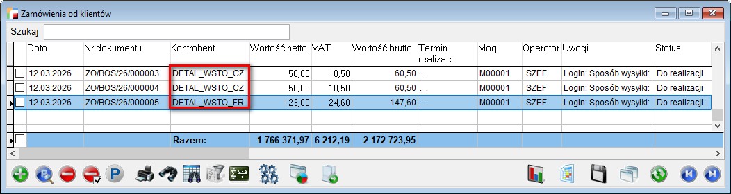 Dla klienta z Czech (CZ), dodany zostanie kontrahent DETAL_WSTO_CZ, natomiast dla klienta z Francji (FR), kontrahent DETAL_WSTO_FR.