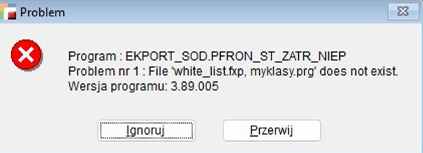 Usunięto komunikat błędu File white_list.fxp, myklasy.prg does not exist, pojawiający się podczas obliczania stanu zatrudniania niepełnosprawnych w eksporcie do SOD.