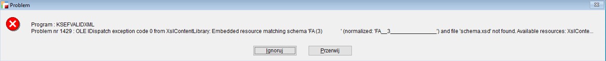 Usunięto komunikat błędu OLE IDispatch exception code 0 from XsIContentLibrary: Embedded resource matching schema FA(3) ‘(normalized: FA__3___’) and file ‘schema.xsd’ not found. Available resouces: XSIContent…, pojawiający się podczas próby generowania XML z eksportu do KSeF.