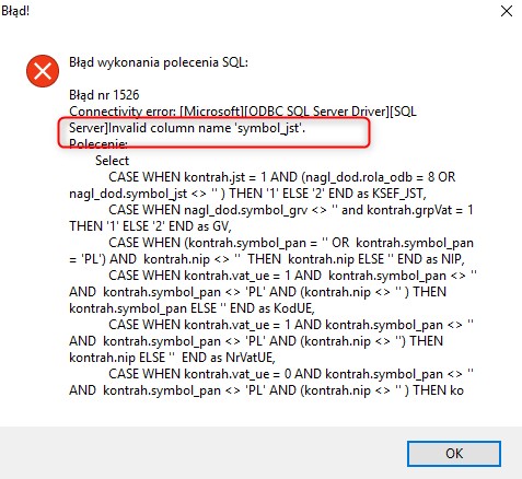 Usunięto komunikat błędu Invalid column name ‘symbol_jst’, pojawiający się podczas próby walidacji i generowania XML dokumentu sprzedaży. Problem związany był z brakiem kolumny SYMBOL_JST w NAGL_DOD.