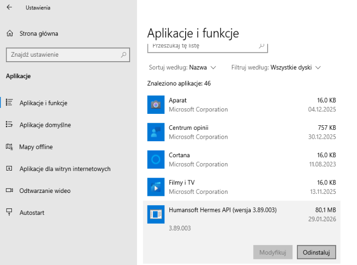 2. Jeśli posiadasz zainstalowany program HermesAPI w dowolnej innej wersji usuń ten program z poziomu Ustawienia -> Aplikacje i funkcje -> Humansoft Hermes API (wersja 3.XX.YYY) lub z poziomu katalogu, gdzie został zainstalowany HermesAPI za pomocą pliku „unis000.exe”.