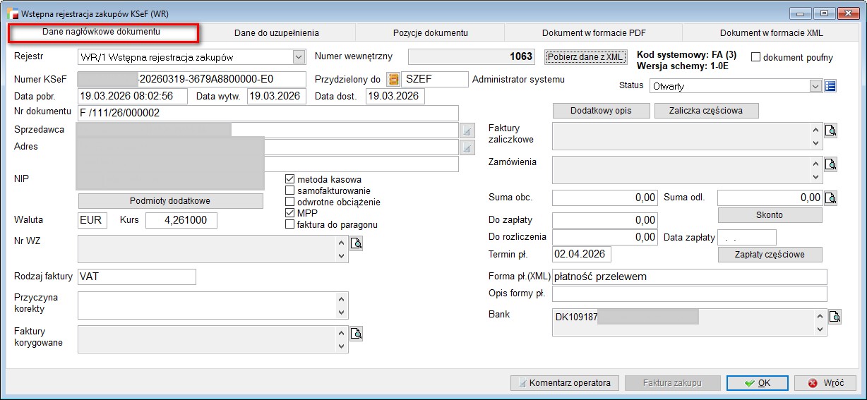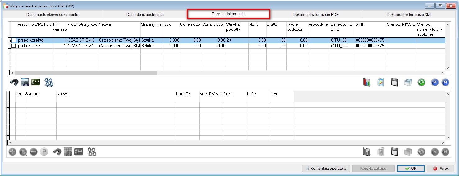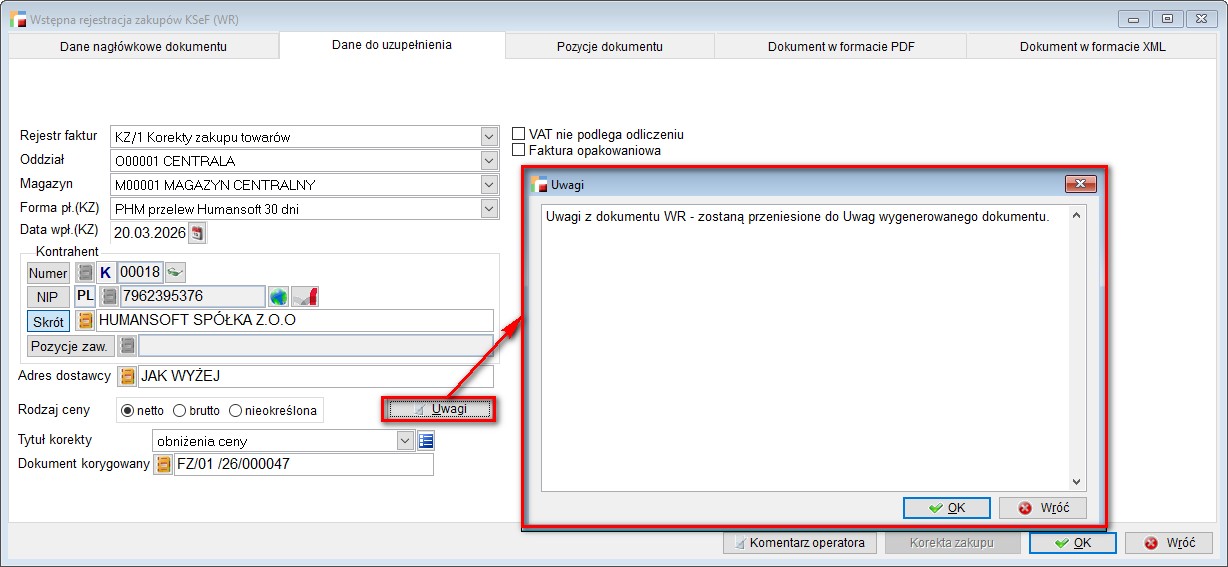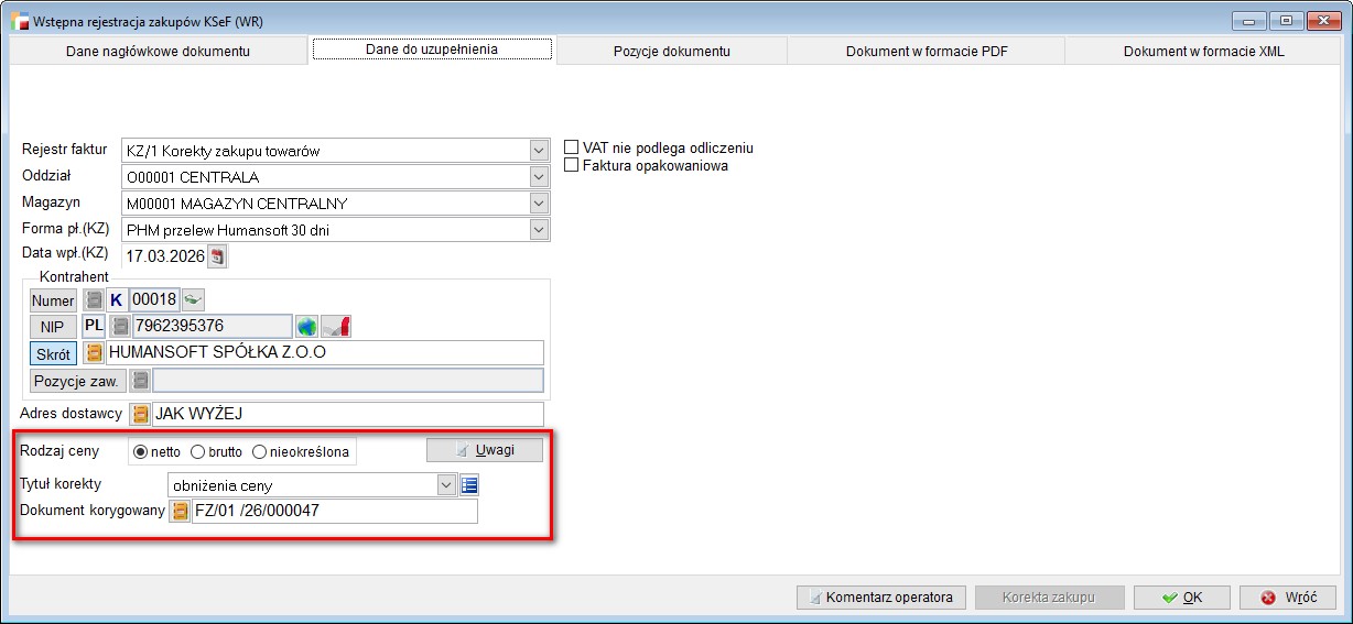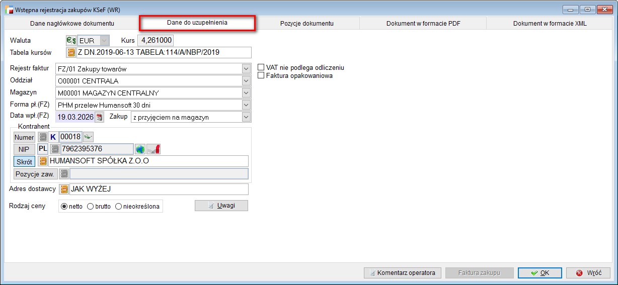 W przypadku pobrania dokumentu z KSeF w rodzaju ceny zaznaczona była opcja nieokreślona bez możliwości edycji. Skutkowało to brakiem możliwości wygenerowania faktury zakupu z WR.
