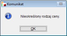 Poprawiono usterkę polegającą na braku możliwości zmiany rodzaju ceny na dokumencie wstępnej rejestracji zakupów WR. W przypadku gdy rodzaj ceny pobranego dokumentu był ustawiony jako nieokreślona, wówczas zablokowane było dodawanie pozycji na trzeciej zakładce dokumentu WR co skutkowało komunikatem Proszę określić rodzaj ceny dokumentu.