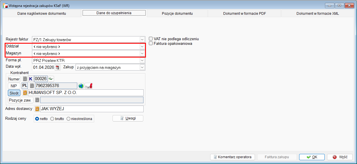 W przypadku ustawienia dla parametru wartości 1, w dokumencie WR będą pojawiać się puste wartości, zamiast bieżącego magazynu i oddziału, dotychczasowego działania programu.