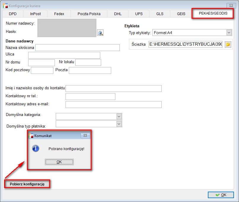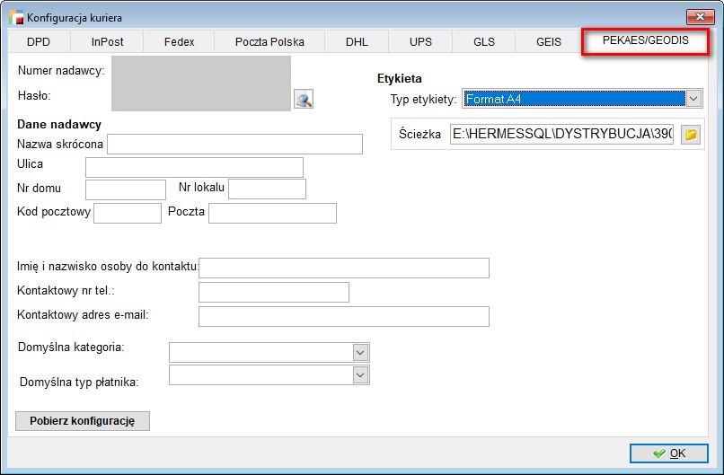 W ustawieniach globalnych dodano konfigurację dla kuriera Pekaes. Należy uzupełnić numer nadawcy i hasło, a następnie zapisać dane.