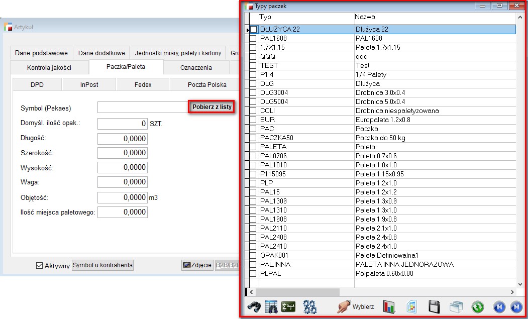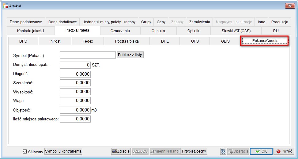 W kartotece Artykuły dla paczki dodano zakładkę Pekaes.