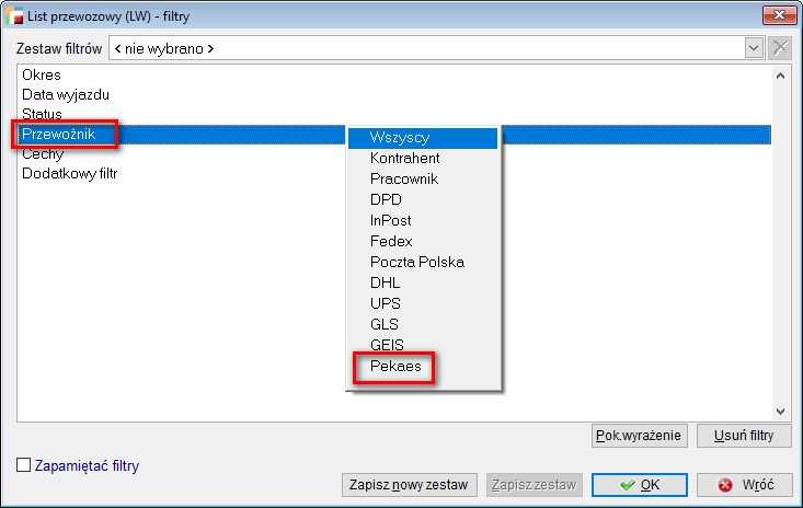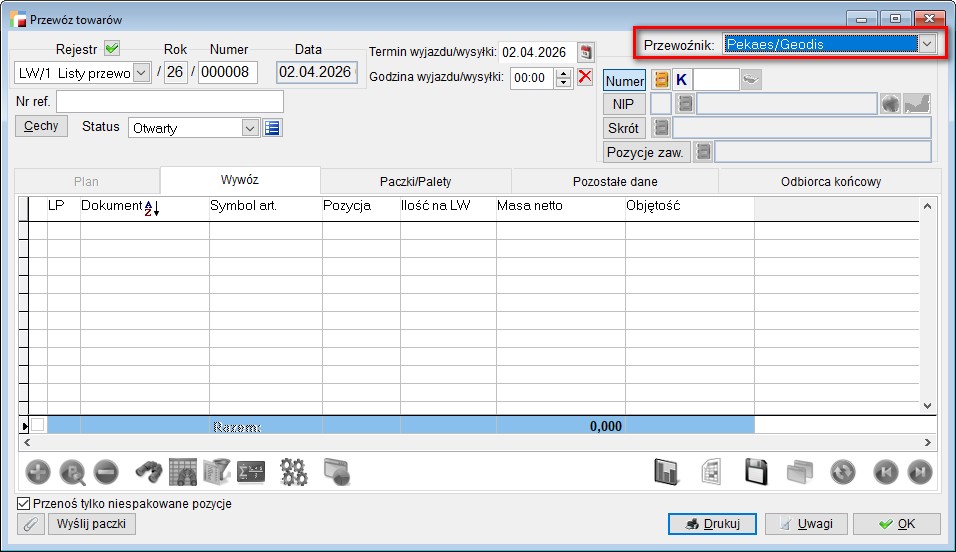 W nagłówku listu kurierskiego na liście przewoźnika dodano rodzaj Pekaes.
