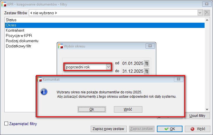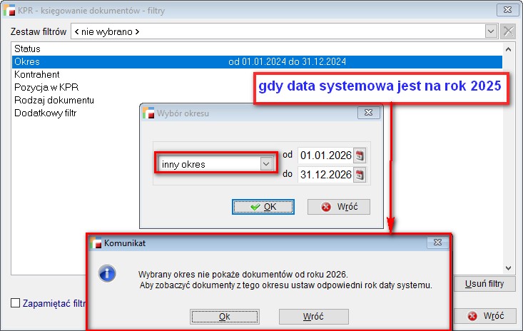 W przypadku gdy data systemowa jest ustawiona na rok 2025, próba wybrania innego okresu, na rok 2026 skutkuje poniższym komunikatem: