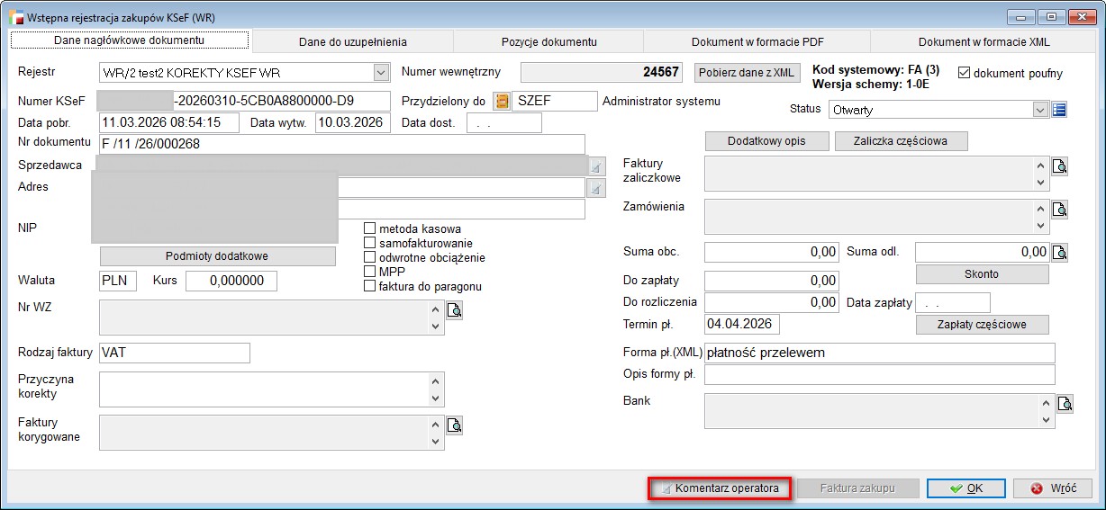 - Komentarz operatora, dostępny w zakładce Dane nagłówkowe dokumentu,
