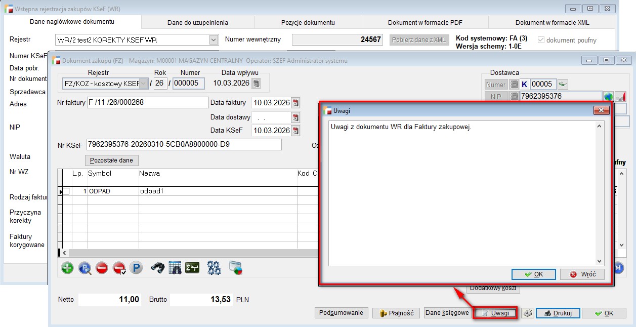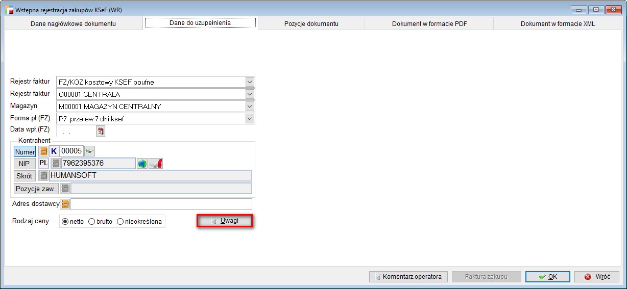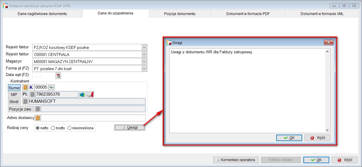 Natomiast dane zawarte w Uwagach dokumentu WR zostaną przeniesione do Uwag na wygenerowanej fakturze zakupu.