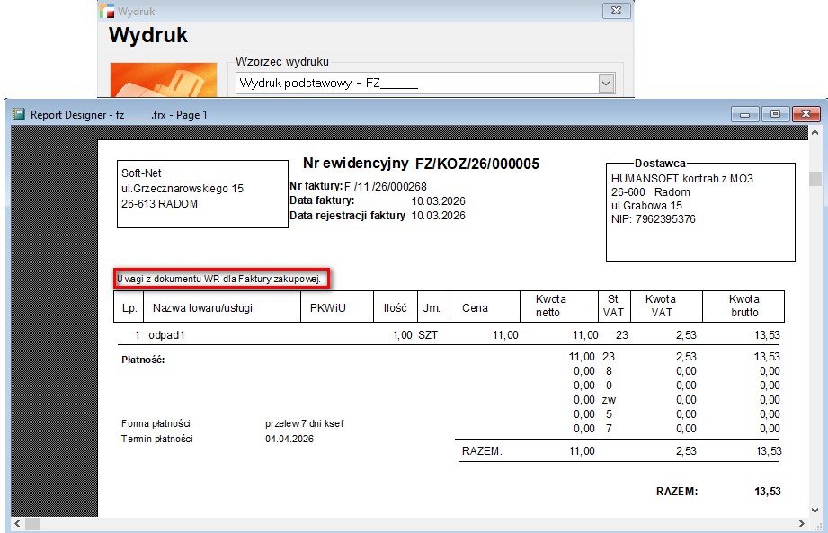 Treść z pola Uwagi zostanie umieszczona na fabrycznych wzorcach wydruku np. FZ__.